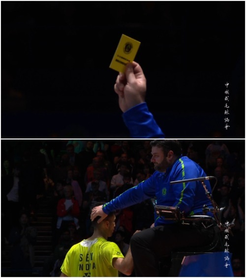 发球偷后场,过程拉高远,拉到生无可恋,羽毛球高高飞起,滑行着自己越来越慢的抛物线,它知道减速的不是自己,还有场上两个打自己的人。那个胖胖的主裁也上头了,不让换球,不给拖地,不想让运动员叫医疗暂停,一直喊着“get ready”,甚至因为选手走慢了两步罕见地掏出了黄牌。