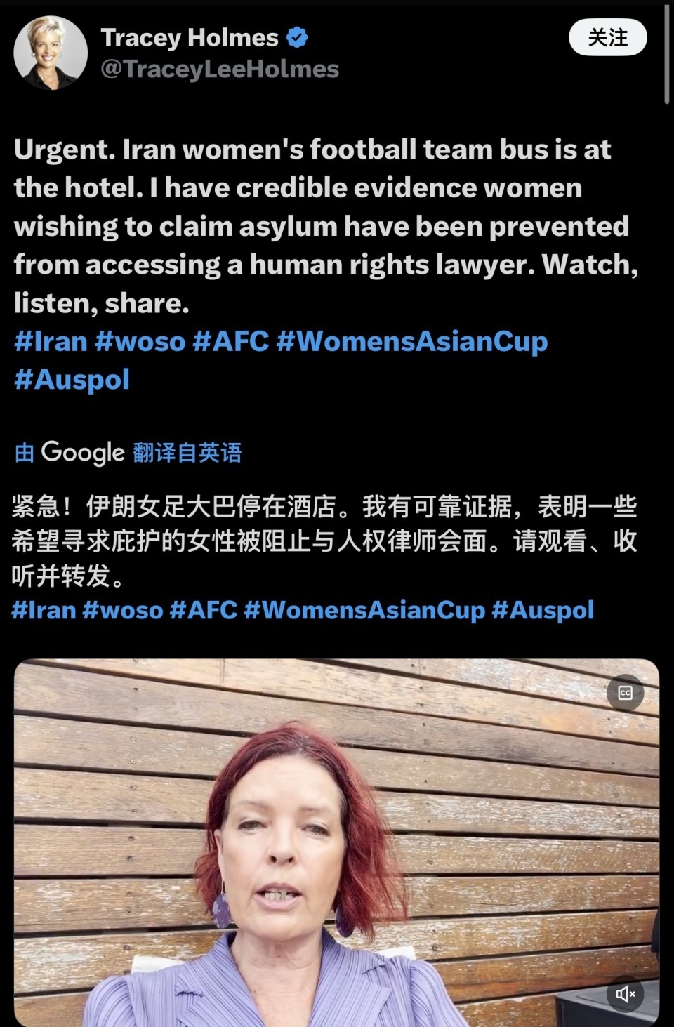 今天上午,根据澳大利亚知名记者特蕾西-霍尔姆斯的最新消息,大巴车目前正停在伊朗女足下榻的酒店门口,但一些希望寻求庇护的女性被阻止与律师见面,情况很紧急。