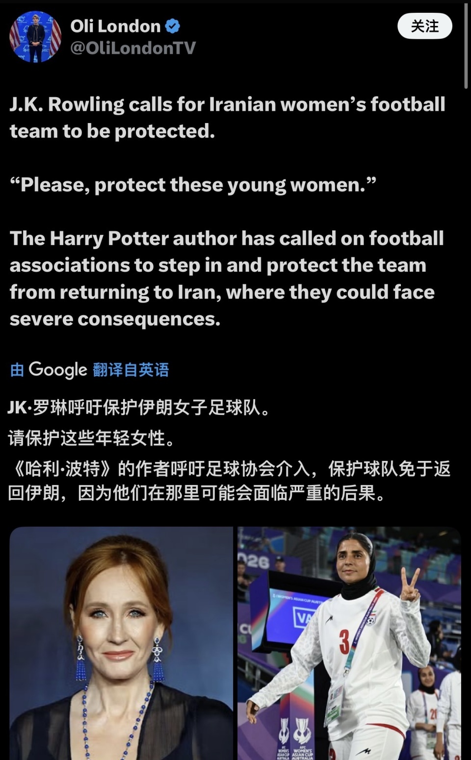 知名作家、《哈利波特》的作者JK罗琳也呼吁保护伊朗女足:“请保护这些年轻女性。”她希望足协能够介入,保护球队免于返回伊朗,因为她们在那里可能会面临严重的后果。